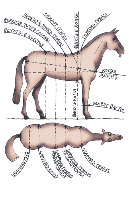 Высотой лошади в холке называется расстояние от холки лошади до земли по вертикали, а если лошадь подкована, то из полученного результата вычитают 1–2 см. По высоте в холке различают лошадей (примерно): до 100 см (в некоторых странах до 142) – пони, до 149 см – мелкие, до 159 см – средние, до 170 см – крупные, свыше 170 см – очень крупные.