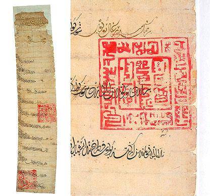 Ох, опять… Вот настоящее фото ярлыка с двумя тамгами, выданного ханом Тохтамышем некоему Бек-Ходжаю: