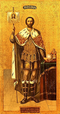 Таким представлен великий князь на двух патрональных иконах: «Избранные святые» [489] и «Святый князь Александр Невский» с предстоящими Иоанном Златоустом, Василием Великим, апостолом Аристархом, Марией Египетской, мученицами Александрой, Людмилой и Надеждой — покровителями семьи иконописцев Дыдыкиных [490] .