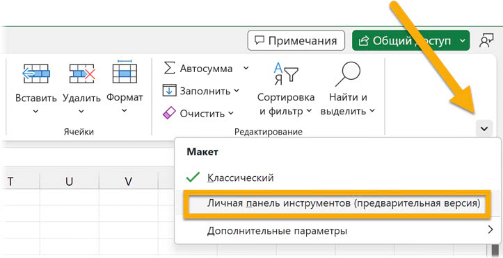 Вот такой инструмент был представлен в феврале 2023 года для участников программы Office Insider (то есть его можно ждать пользователям Office 365 и будущей «коробочной» версии Excel, в версии 2021 его нет) – набор команд и инструментов под лентой, личная панель инструментов (Personal Toolbar). Это своего рода отсылка к старой панели инструментов из Excel 2003 для тех, кому такой вариант удобнее, чем ленточный интерфейс с вкладками. В «Параметрах Excel» можно добавить команды на новую панель.