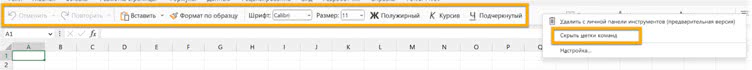 Внешний вид немного отличается от панели быстрого доступа, два варианта отображения команд в наличии, есть опция «Показать метки команд» (Show command labels) в контекстном меню (по правому щелчку мыши).