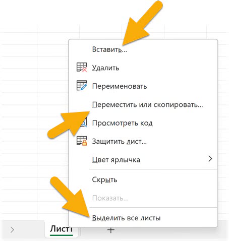 Вот, например, контекстное меню, которое открывается по щелчку правой кнопкой мыши по ярлыку листа: