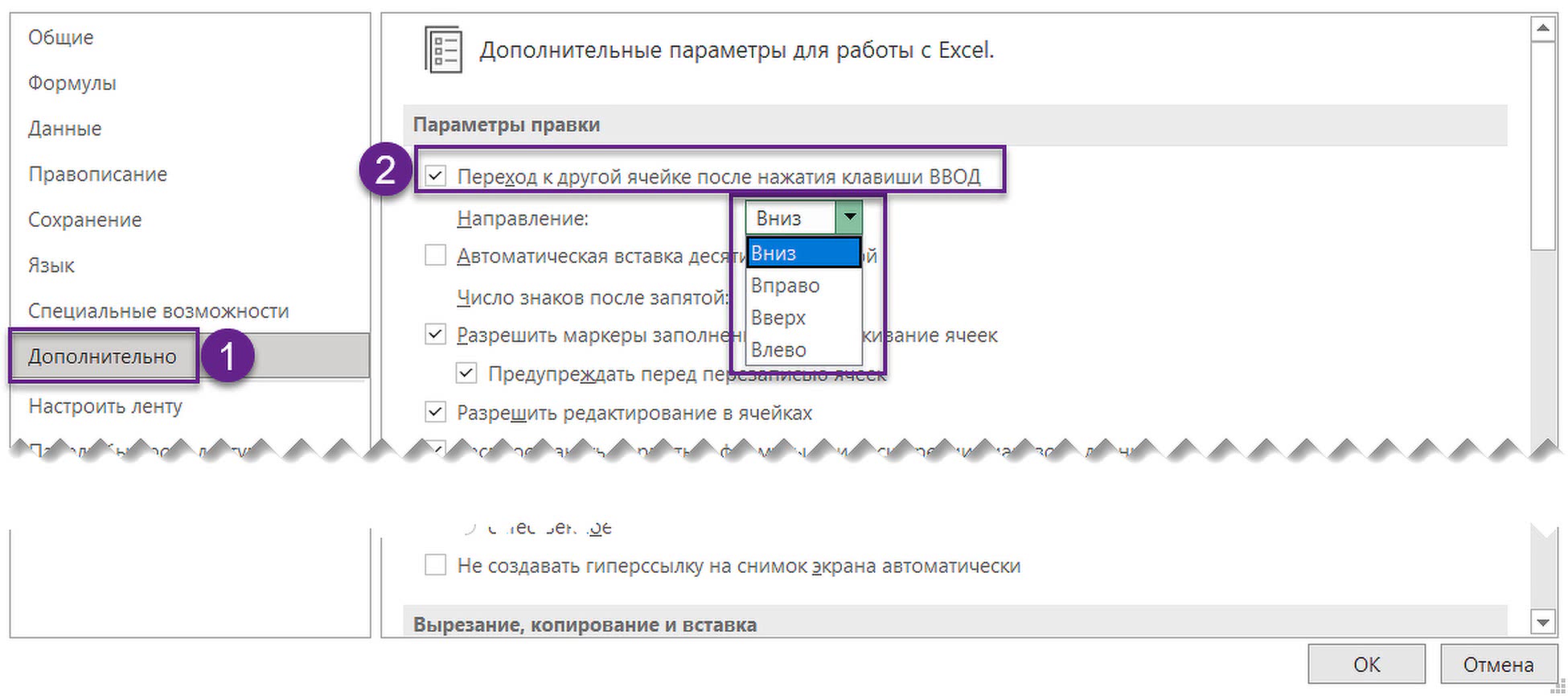 Параметры -> Дополнительно -> Переход к другой ячейке после нажатия клавиши ВВОД.