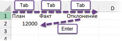 Если вы ввели несколько значений в соседние столбцы (через Tab), а затем нажали Enter, то попадете в начало следующей строки (в первый столбец). Так удобно заполнять небольшие таблицы.
