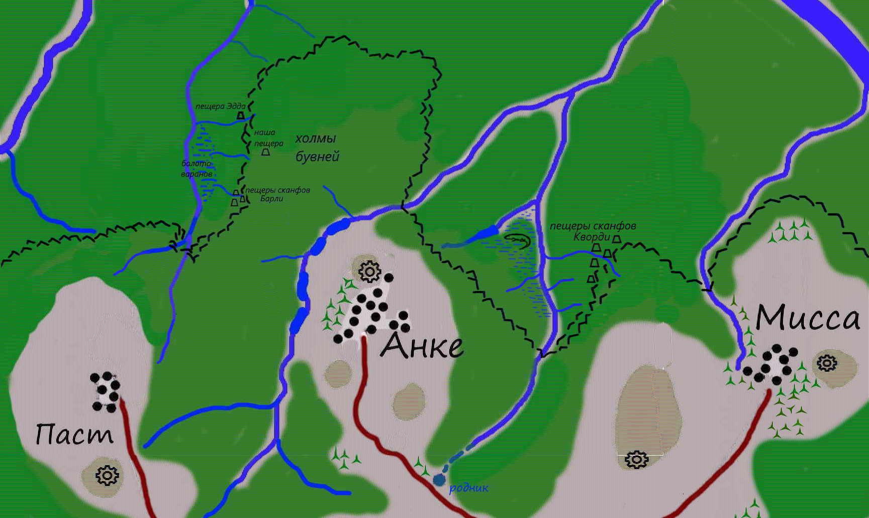 Карта окрестностий Анке и Миссы, срисованная Ранком у сканфов поселения Кворди.