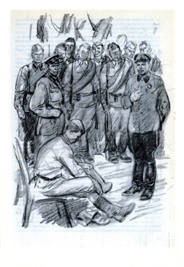 Оттащил Гулевский омертвевшего врага в сторону от фашистских траншей, кинул на снег и принялся катать его, мять, тузить, по щекам исхлестал. Крутые солдатские меры подействовали лучше всякого искусственного дыхания. Очухался фашист и потянулся к шубе, которую с него сбросил старшина. А шуба — штатского покроя, с каракулевым воротником шалью.