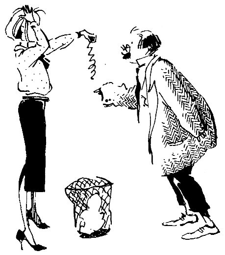ОН — Что же она такое плетет? /Встает и отбирает у нее трубку/ — Алло, это вы, дорогой мой? Да не обращайте вы внимания на мою секретаршу, она — бестолочь… Черт! Бросил трубку! /Вешает свою трубку и обращается к ней/ — А вы, случайно, немного не того, а?