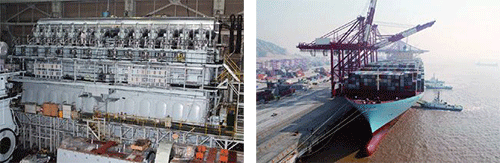 На этих двух фотографиях изображены крупный дизельный корабельный двигатель и огромный корабль, на котором может быть установлен такой двигатель.