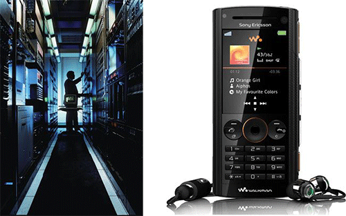 На этих двух фотографиях изображены телефонный коммутатор и телефон (в который встроены фотоаппарат, MP3-плеер, FM-радиоприемник и веб-браузер).