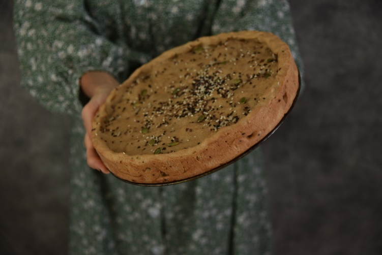 Насыпать в миску муку, хорошо ее перемешать, подсолить, влить масло, затем горячу воду, кунжут, можно заменить любой пряностью или зеленью, замесить тесто. Получается оно теплое, мягкое и тугое одновременно. Разделить на 2 части, примерно 2/5 и 3/5. Раскатать основание и верх пирога около 2 мл толщиной. Смазать форму маслом, выложить большую часть в форму, сделать проколы вилкой. Равномерно распределить начинку, затем закрыть пирог, убрать ножницами лишнее, хорошо скрепить обе части между собой. Я сделала прорезы острым ножом, смазала водой и украсила семечками. Запекать в духовке при температуре 200 градусов 30-35 минут. Остудить под полотенцем.