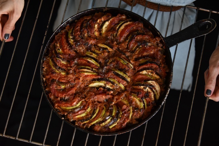 Порезать все овощи кружочками, выложить в форму поочередно. Баклажаны преждевременно замочить в теплой соленой воде на 15 минут, чтобы убрать горечь. Я кожицу с овощей не счищала, чтобы максимально сохранить пользу. Залить соусом и поставить в духовку при 190 градусах на 35-40 минут, судить о готовности по баклажану. Определить готовность баклажана можно довольно просто – если он легко прокалывается вилкой, значит готов. В этом блюде он запекается дольше других овощей. Не желательно запекать овощи при слишком большой температуре.
