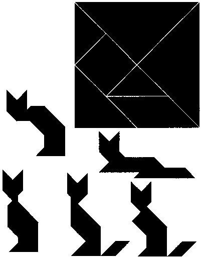Разрежьте бумажный квадрат на 7 частей, как показано на схеме вверху. Попробуйте составить из этих частей всех изображенных здесь кошек. Каждая кошка должна состоять из всех 7 частей квадрата.