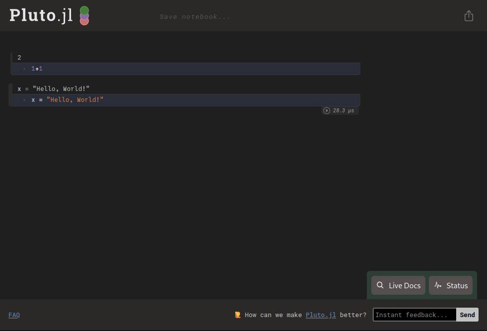 Pluto – это другой блокнот, созданный специально для работы с языком программирования Julia. Блокнот Pluto состоит из небольших блоков кода Julia (ячеек), и вместе они образуют реактивный блокнот. Когда вы меняете переменную, Pluto автоматически перезапускает ячейки, которые на нее ссылаются. Ячейки можно размещать в произвольном порядке – интеллектуальный синтаксический анализ определяет зависимости между ними и позаботится о выполнении. Некоторые отличительные черты Pluto: