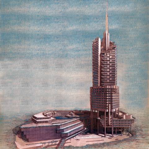 Большую часть площади комплекса занимала трёх-пятиэтажная застройка, широкими ступенями поднимающаяся от дорожного кольца. На первых этажах виднелись магазины — детский мир, универсам, ещё какие-то, по утреннему времени закрытые. Всё это ступенчатое здание закручивалось спиралью так, что к самому её центру можно было подойти и подъехать. Но архитектурной доминантой этого комплекса выступала не спираль, а возвышающаяся над нею башня. Даже Башня. Поднятая на несколько метров выше основной части комплекса на мощных сваях, она немного сужалась к верхним этажам и заканчивалась стремящимся в небо шпилем. Как есть ракета на стартовом столе!