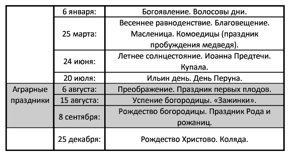 Православное духовенство не так уж было и виновато в такой неискоренимости языческих традиций. Во-первых, в своей хозяйственной жизни славянские земледельцы и в XVI и в XIX в. по-прежнему, как и в первобытности, находились в полной зависимости от природы и ее непредсказуемых капризов. Во-вторых, христианство в своей религиозной доевангельской первооснове содержало ряд архаичных общечеловеческих представлений о силах, управляющих стихиями, и о способах молитвенного и магического обращения к ним. Достаточно сопоставить основные церковные русские праздники с солнечными фазами и с важнейшими точками хозяйственного года, чтобы убедиться в возможности совместимости старого славянского календаря с новым христианством. А это решало половину вопросов народной общественной обрядности: