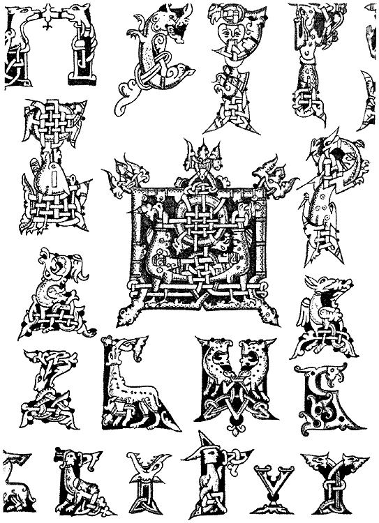Заглавные буквы-инициалы (рис. 3) в богослужебных книгах с первой четверти XIV в. приобретают очень живой, иной раз даже гротескный характер, далеко уводя читателя от торжественности содержания книги в живой и веселый быт средневекового города: переругивающиеся рыбаки, старик, греющий руки у костра (приписка: «Мороз! Руки греет…»), дерущиеся на поединке горожане, новгородец, обливающийся водой, гусляр, которому художник желает успеха («Гуди [играй] гораздо!»), — все это свидетельства известной секуляризации церковного книжного искусства, внесения жизненной, мирской струи в церковное по существу искусство. Стригольников не обвиняли в такой вольности, но новый стиль орнаментики — знамение времени.