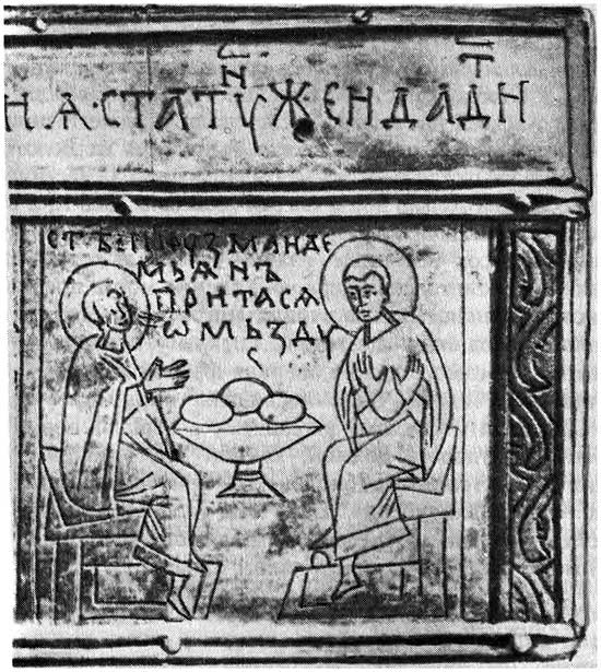 Рис. 5. Изображения святых — «безмездников» Козьмы и Дамиана на ларце XIV в. Стригольники, порицавшие духовенство за «дары» и поборы, противопоставляли ему культ Козьмы и Дамиана, «врачей безмездников» (отказывавшихся от платы).