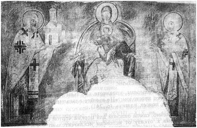 Рис. 36. Ктиторские портреты архиепископов Моисея (слева, с моделью храма в руках) и Алексея. Фреска Успенской церкви в Волотове под Новгородом. Моисей был строителем церкви в 1352 г., а при Алексее (конец 1380-х гг.) церковь была полностью расписана.