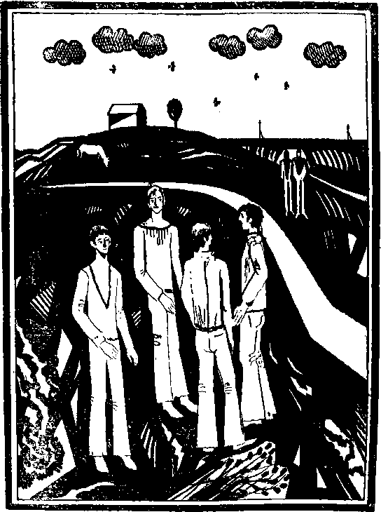 …Мы сидим у дороги, болтаем ногами в ручье, который протекает по дну рва, грязный, цвета глины. Между высокими замершими травинками прыгают кузнечики.