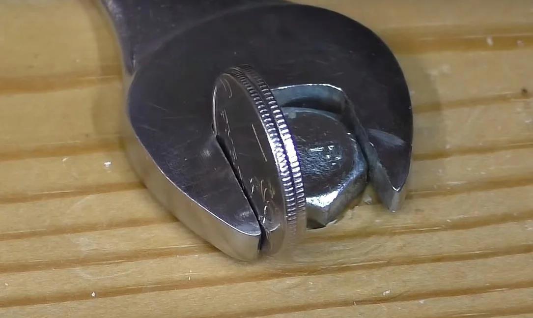 Ключ упираем в болт, одна монета, две... Три в самый раз зашло. Отлично!