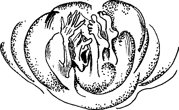 Девочка и бабушка испугались, ни живы ни мертвы стоят. А из темного угла вышло на свет маленькое, лохматенькое, голова с лукошко, нос — картошкой. Дверь сама отворилась. Перевалилось маленькое, лохматенькое за порог и пыльным столбом по дороге унеслось.