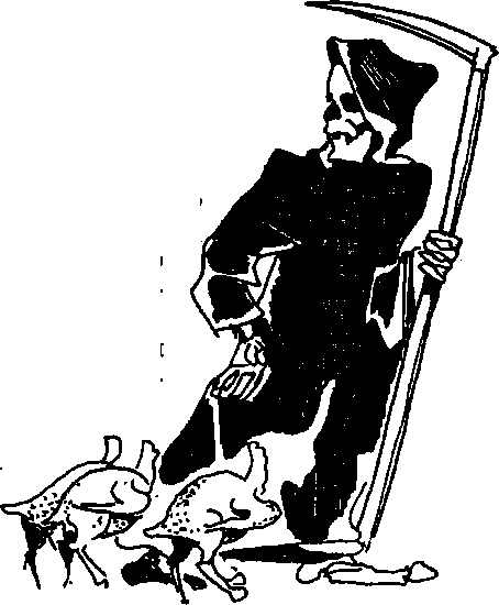 Дятлы сидели в брюхе людоеда-пылесоса. Они стали сильными длинными клювами долбить его. Людоед-пылесос от боли упал на землю. Он корчился и стонал. Дятлы продолбили в брюхе дырки и улетели в лес. От ран людоед-пылесос умер.