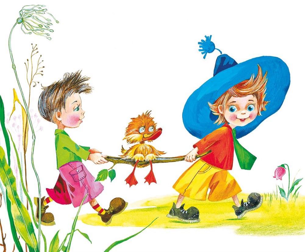 По утрам малыши кормили птенца всякой едой. У него был отменный аппетит. Своим плоским клювом он молотил всё подряд – травку, зёрнышки, печенье, конфеты – и даже с удовольствием засовывал клюв в миску с сиропом, который носил ему Сахарин Сахариныч, приговаривая: