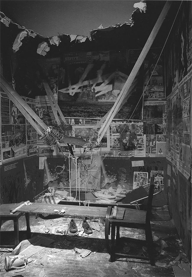 «Космос» Кабакова, задуманный в 1982-м и осуществленный в 1986 году, также напоминает о Хармсе, через которого прочитан Малевич. Но сразу укажем на существенное различие этих двух инсталляций дыры. Если «Ноль объект» – естественное образование, существующее, ничего не нарушая, как бы в параллельном пространстве (Новиков всегда предпочитал слово «параллельный» выражениям «нонконформизм» или «неофициальное искусство»), то произведение Кабакова катастрофично, здесь выход в четвертое измерение обнаруживает, что другие три – не более чем хаос и хлам. Комната Кабакова, откуда улетает в космос его персонаж, оставив, подобно космическому кораблю в атмосфере, грандиозную дыру в потолке, – зрелище жалкого, непривлекательного быта. Стены оклеены политическими плакатами, как во временном жилье (вагончиках, дачных времянках и пр.), раскладушка вместо кровати, стол, сделанный из доски, и все это щедро посыпано битой штукатуркой. Невольно вспоминается любимая цитата Е. Ф. Ковтуна из К. С. Малевича: «Земля брошена, как дом, изъеденный шашлями». Но отсутствующий житель этого дома мыслится не как «землянит», переселившийся в свой новый «планит», а как хармсовский советский персонаж, неудачно пытавшийся «поставить себя на твердую ногу» и наконец освободившийся от земной юдоли. Такой вот человек, как автор послания Н. М. Олейникова «О нулях», который просил: