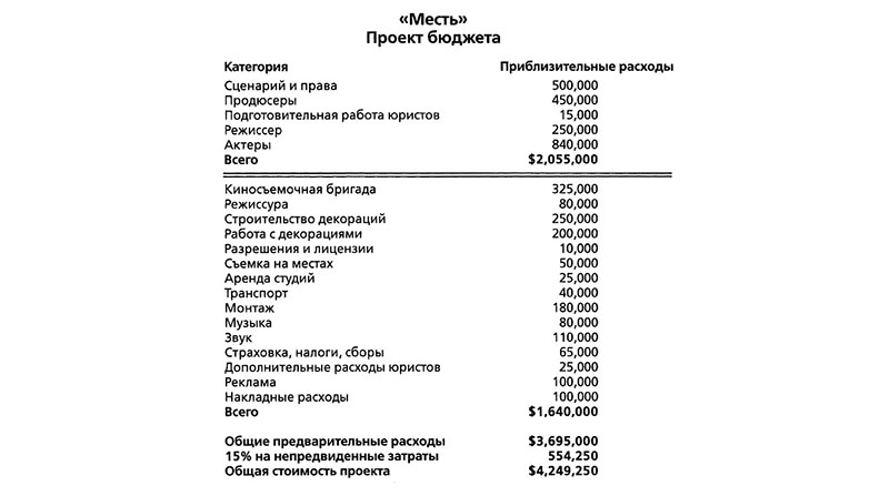 Сметные расходы — это «крупные», важные статьи затрат, которые связаны с подготовкой фильма к производству, включая покупку прав на сценарий, юридические процедуры и зарплаты режиссера, продюсера и актеров.