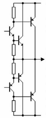 Верхнее плечо — на составном транзисторе Дарлингтона, нижнее — на транзисторе Шиклаи. Введение дополнительного транзистора VT2, аналогично VT4, VT5, симметрируют входное сопротивление плеч. При этом искажения уменьшаются в 2..3 раза.