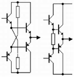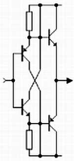 Повышенная нагрузочная способность достигнута за счёт введения активных источников тока в эмиттеры входных транзисторов.