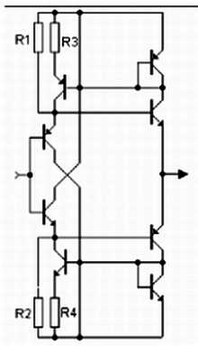 Реализован за счёт быстродействующей линейной положительной обратной связи с помощью транзисторов VT1-VT3.