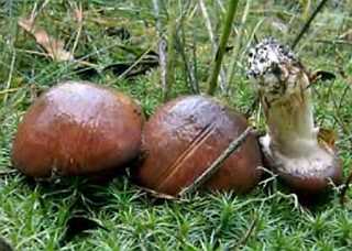 Масленок желтый имеет шляпку коричневого, темно-коричневого или желто-коричневого цвета. Мякоть гриба светло-желтая (существует несколько видов масленков, на рис. показан один из них — масленок обыкновенный, Suillus luteus — прим. ред.).