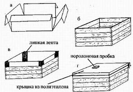 а — вкладыш из полиэтилена; б — ящик; в — ящик в сборе; г — ящик, заполненный питательной средой и грибницей.