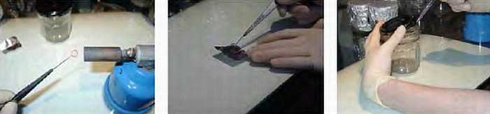 Получив отпечаток, можно начинать производство грибной культуры. Простерилизуйте инокуляционную петлю или скальпель поместив его в пламя спиртовки или бутановой горелки на пять или десять секунд, пока он не разогреется докрасна. (Если используется бутановая горелка, приберите её пламя до минимума, чтобы минимизировать перемещение воздушных потоков). Охладите скальпель, поместив его кончик в стерильную среду в чашке Петри, и затем соскребите немного спор с отпечатка. Перенесите их на агар проведя по его поверхности скальпелем. Подобного результата можно добиться потерев скальпелем по отпечатку, так чтобы споры сами упали в открытую чашку Петри (на снимке, вместо чашки Петри, используется подходящая банка — прим. ред.). Начиная культуру со спор, желательно заразить как минимум три чашки с агаром, чтобы получить хорошие шансы на всхожесть. Мицелий выращенный таким образом называется мультиспоровой культурой.