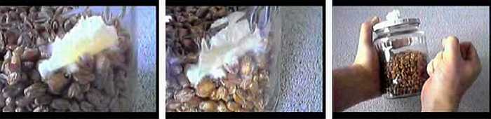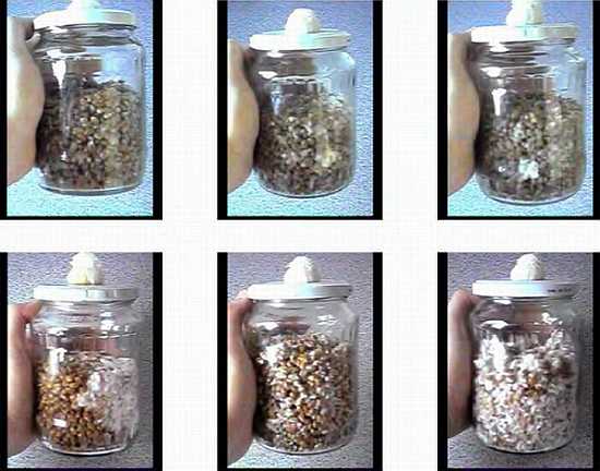 Но, поскольку большая часть зерна еще не обросла мицелием и риск ее заражения еще слишком велик, перетряхивать субстрат следует очень аккуратно. При перетряхивании, нужно следить за тем, чтобы зерно как можно меньше касалось крышки банки и самого тампона. В этих местах могут находиться посторонние микроорганизмы, пробравшиеся "из вне", которые могут привести к заражению субстрата. Следует не "трясти" банку из стороны в сторону, а удерживая её в одной руке, другой рукой наносить удары по нижней части банки. Таким образом, субстрат будет перемешиваться внизу банки, почти не попадая в ее верхнюю часть. Сразу после перетряхивания субстрата, зёрна обросшие мицелием теряют свою "пушистость" и их практически невозможно отыскать в общей массе.