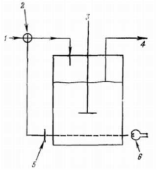 1 — поступление среды, 2 — насос, 3 — мешалка, 4 — сток культуры, 5 — фотоэлемент, 6 — источник света.