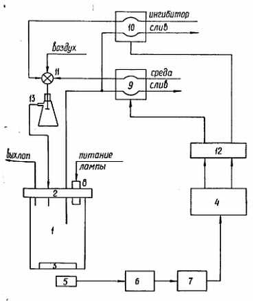 Рис. 18. Турбидостат (схематически) с автоматической регуляцией оптической плотности культуры.