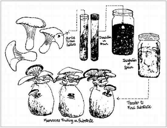 Комментарий к тексту на рисунке (по часовой стрелке): Sterile Tissue Culture — стерильная ткань гриба, Inoculation in Grain — инокуляция зерна, Incubation of Spawn — рост зернового мицелия,Transfer to Final Substrate — перенос на основной субстрат, Mushrooms Fruiting in Substrate — плодоношение грибов на субстрате.