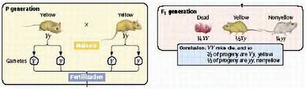 У Менделя получились одинаковые численные соотношения при расщеплении аллелей многих пар признаков. Это в частности подразумевало одинаковую выживаемость индивидов всех генотипов, но это может быть и не так. Бывает, что гомозигота по какому-нибудь признаку не выживает. Например, желтая окраска у мышей может быть обусловлена гетерозиготностью по одной из пар аллелей (слайд). При скрещивании таких гетерозигот друг с другом следовало бы ожидать расщепление по этому признаку соотношении 3:1. Однако наблюдается расщепление 2:1, то есть 2 желтых к 1 белой (рецессивная гомозигота). Показано, что доминантная (по окраске) гомозигота не выживает уже на эмбриональной стадии. Этот аллель одновременно является рецессивной леталью (то есть рецессивной мутацией, приводящей к гибели организма).