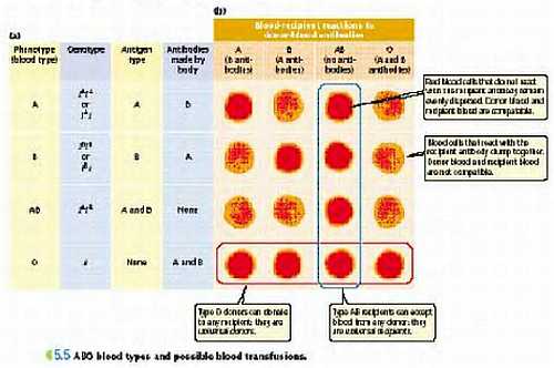 Если донором (то есть сдающим кровь) является человек, у которого ни одного из антигенов нет (группа крови 0), то его кровь можно переливать кому угодно — она не будет вызывать агглютинации у реципиентов (тех, кому кровь переливают) с любым типом крови. Таким образом, люди с типом крови 0 являются универсальными донорами. И наоборот, в крови людей с группой АВ не содержатся антитела ни на один из этих антигенов (ни на А, ни на В) и эти люди счастливы быть универсальными реципиентами — переливать кровь им можно от людей своей и всех остальных групп крови. То есть человек с группой крови АВ может принять кровь с любым типом. Самый плохой случай для реципиента — нулевая группа крови, которая будет реагировать с группами крови А, В и АВ.
