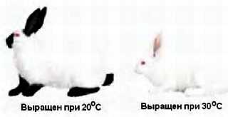 Экспрессия некоторых генотипов может зависеть от внешних условий. Ниже показаны два кролика, один из которых с темными пятнами. Аллель гималайской окраски у кролика температурочувствителен. При повышенной температуре белок не функционален и необходимый пигмент не образуется, а при нормальной температуре получается кролик, у которого некоторые участки шкуры окрашены.