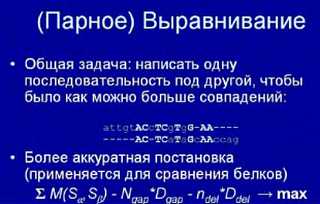Нам надо при сравнении найти наилучший вариант, так выровнять эту пару последовательностей, чтобы количество совпадений будет максимальным (парное выравнивание). Качество выравнивания оценивают, назначая штрафы за несовпадение букв и за наличие пробелов (когда приходится раздвигать одну последовательность для того, чтобы получить наибольшее число совпадающих позиций).