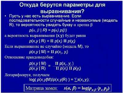 Откуда берутся матрицы замен? Мы берем некоторое количество выравниваний, в которое по тем или иным причинам верим, и смотрим, как часто у нас происходят такие замены. Тогда матрица замен является логарифмом отношения некоторых вероятностей, которые можно оценить как частоты.