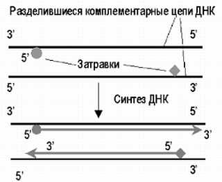 К анализируемому образцу ДНК добавляют в избытке 2 синтетических олигонуклеотида — праймера размером около 20 нуклеотидов. Каждый из них комплементарен одному из 3'-концов фрагмента ДНК. ДНК нагревают для разделения цепей двойной спирали, а при охлаждении происходит гибридизация праймеров с комплементарными участками фрагментов ДНК. В результате в растворе будут находиться однонитевые ДНК с короткими двухцепочечными участками — затравками (праймерами). При добавлении нуклеотидов и ДНК-полимеразы синтезируются комплементарные цепи и образуются идентичные фрагменты ДНК (первый цикл, рис. 43). Реакция останавливается и ДНК снова денатурируется прогреванием.