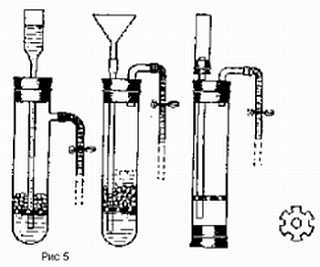 В качестве автоматического прибора можно использовать склянку Тищенко. Кусочки твердого вещества должны быть в этом случае достаточно мелки, чтобы они проходили в узкое горлышко склянки. Для наполнения кислотой склянку наклоняют почти горизонтально и кислоту наливают через воронку с узким, оттянутым и изогнутым концом, который входил бы в боковой отросток склянки. Зажим при этом должен быть закрыт. Можно также сначала налить в склянку через горлышко кислоту, затем присоединить к отростку склянки каучук, через который ртом высасывать воздух, пока кислота не перейдет в левую половину склянки, после чего зажать каучук (пальцами или зажимом), всыпать через горлышко цинк, вставить в склянку пробку и снять каучук с отростка. Склянку Тищенко следует выбрать с возможно малым отверстием в перегородке. Большое преимущество такого прибора — устойчивость и простота обращения при работе. Для лабораторных опытов учащихся очень удобны небольшие автоматические приборы, имеющиеся в продаже, а также самодельные — из большой пробирки или широкой стеклянной трубки (рис. 5).