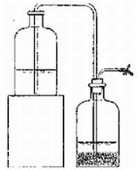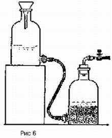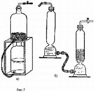 В таком приборе жидкость переливается в реакционную склянку с помощью сифонной трубки и вытесняется в верхний сосуд давлением газа при перекрывании! газоотводной трубки зажимом.