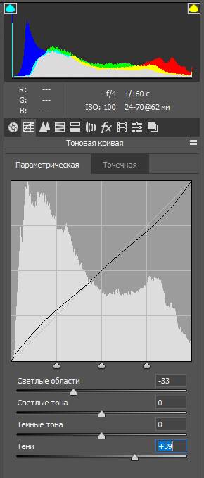 VIII б. Если диапазона светлые области или тени не достаточно для получения требуемого эффекта откройте окно тоновая кривая. Выберите параметрическая кривая, выполните коррекцию.