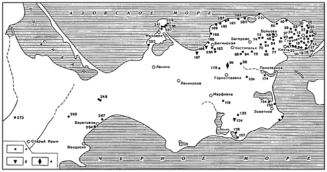 1 — Глейки; 2 — Маяк I; 3 — Маяк II; 4 — Маяк III; 5 — Маяк IV; 6 — Маяк V; 7 — Маяк VI; 8 — Хрони I; 9 — Хрони II; 10 — Хрони III; 11 — Хрони IV; 12 — Глазовка; 13 — Жуковка; 14 — Опасное I; 15 — Опасное II; 16 — Синягино; 17 — Каменка I; 18 — Каменка II; 19 — Капканы I; 20 — Капканы II; 21 — Капканы III; 22 — Змеиный мыс; 23 — Капканы IV; 24 — Капканы V; 25 — Осовины I; 26 — Осовины II; 27 — Осовины III; 28 — Осовины IV; 29 — Юркино I; 30 — Юркино II; 31 — Темир-гора II; 32 — Темир-гора III; 33 — Темир-гора I; 34 — Темир-гора IV; 35 — Темир-гора V; 36 — Партизаны I; 37 — Партизаны II; 38 — Партизаны III; 39 — Партизаны IV; 40 — Юркино Iа; 41 — Бондаренково I; 42 — Бондаренково II; 43 — Бондаренково III; 44 — Бондаренково IV; 45 — Бондаренково V; 46 — Бондаренково VI; 47 — Карантинная слобода; 48 — Войково I; 49 — Войково II; 50 — Войково III; 51 — Войково IV; 52 — Войково V; 53 — Войково VII; 54 — Войково VI; 55 — Войково VIII; 56 — Войково IX; 57 — Войково X; 58 — Войково XI; 59 — Тархан I; 60 — Тархан II; 61 — Тархан III; 62 — Тархан IV; 63 — Мичурино I; 64 — Мичурино II; 65 — Мичурино III; 66 — Октябрьское I*; 67 — Октябрьское VI; 68 — Октябрьское II; 69 — Октябрьское III; 70 — Октябрьское IV; 71 — Октябрьское V; 72 — Малый Бабчик; 73 — Туркмен I; 74 — Туркмен II; 75 — Андреевка Северная*; 76 — Андреевка Южная*; 77 — Золотой курган; 78 — Восход I; 79 — Восход II; 80 — Восход III; 81 — Солдатская слободка; 82 — Ак-Бурун; 83 — Кезы; 84 — Багерово; 85 — Октябрьское VII; 86 — Андреевка I; 87 — Андреевка II; 88 — Восход IV, 89 — Восход V; 90 — Войково XII; 91 — Бондаренково VII; 92 — Войково XIII; 93 — Партизаны V; 94 — Либкнехтовка*; 95 — Либкнехтовка II; 96 — Либкнехтовка III; 97 — Тасуново II; 98 — Тасуново I*; 99 — Тасуново III; 100 — Калиновка, 101 — Горностаевка I; 102 — Горностаевка II; 103 — Горностаевка III; 104 — Михайловка*; 105 — Михайловка II, 106 — Новоселовка I; 107 — Новоселовка II; 108 — Новоселовка III; 109 — Марфовка VI; 110 — Марфовка V; 111 — Марфовка II; 112 — Марфовка III; 113 — Марфовка IV; 114 — Марфовка VII; 115 — Марфовка Западная*; 116 — Тамарино I; 117 — Тамарино II; 118 — Тамарино III; 119 — Тамарино IV, 120 — Прудниково I; 121 — Просторное; 122 — Пташкино; 123 — Борисовка I; 124 — Борисовка II; 125 — «Холм А»*; 126 — Опук*; 127 — Киммерик*; 128 — Кояш; 129 — Марьевка I*; 130 — Марьевка II; 131 — Марьевка III; 132 — Марьевка IV; 133 — Марьевка V*; 134 — Вязниково I; 135 — Вязниково II; 136 — Вязниково III; 137 — Высокое I; 138 — Высокое II; 139 — Стрелковое I; 140 — Стрелковое II, 141 — Голубое, 142 — Яковенково I; 143 — Яковенково II, 144 — Яковенково III; 145 — Яковенково IV; 146 — Яковенково V; 147 — Яковенково VI; 148 — Яковенково VII; 149 — Заветное I; 150 — Заветное II; 151 — Заветное III, 152 — Заветное IV; 153 — Заветное V; 154 — Костырино*; 155 — Коренково I; 156 — Коренково II; 157 — Коренково III; 158 — Коренково IV; 159 — Челябинцево I; 160 — Челябинцево II; 161 — Челябинцево III; 162 — Челябинцево IV; 163 — Огоньки I*; 164 — Огоньки II; 165 — Сокольское I; 166 — Сокольское II; 167 — Сокольское III; 168 — Героевка V; 169 — Героевка I*; 170 — Героевка II; 171 — Героевка III; 172 — Героевка IV; 173 — Южный Чурубаш*; 174 — Чурубаш*; 175 — Приозерное; 176 — Огородное; 177 — Васильевка; 178 — Ново-Николаевка I; 179 — Ново-Николаевка II*; 180 — Державино I; 181 — Державино II; 182 — Державино III; 183 — Пресноводная I; 184 — Пресноводная II; 185 — Ново-Отрадное I*; 186 — Ново-Отрадное II; 187 — Золотой Рожок*; 188 — Золотое I*; 189 — Золотое II; 190 — Золотое Восточное бухта*; 191 — Золотое Восточное I*; 192 — Куль-тепе I*; 193 — Куль-тепе II; 194 — Верхнее Заморское; 195 — Зеленый Яр I; 196 — Зеленый Яр II; 197 — Зеленый Яр III; 198 — Песочное I; 199 — Песочное II; 200 — Песочное III, 201 — Виноградное I; 202 — 