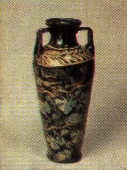 Пантикапей. Амфора зеленого стекла с росписью эмалевыми красками, конец I в. до н. э.